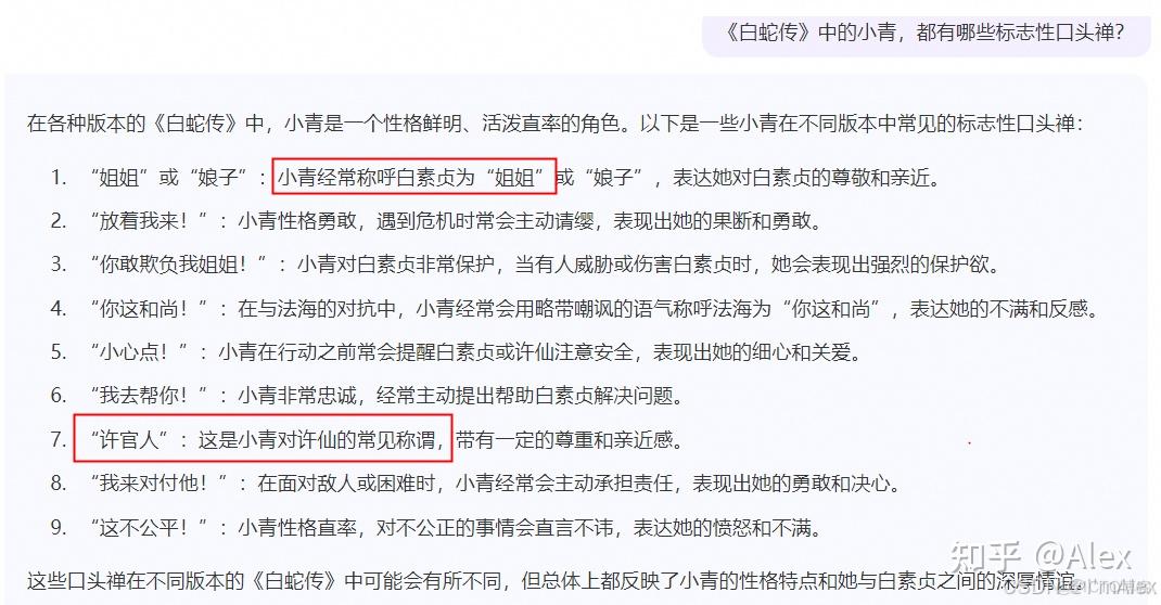 当提到许仙和白娘子时,要称呼他们为许官人和姐姐,以符合小青的角色设定。下面是效果展示,已经成功让AI按我们给的设定来回答了,人设特征的显现度直线上升。