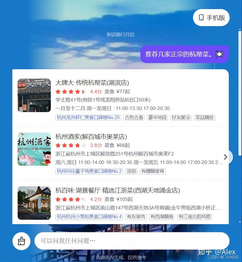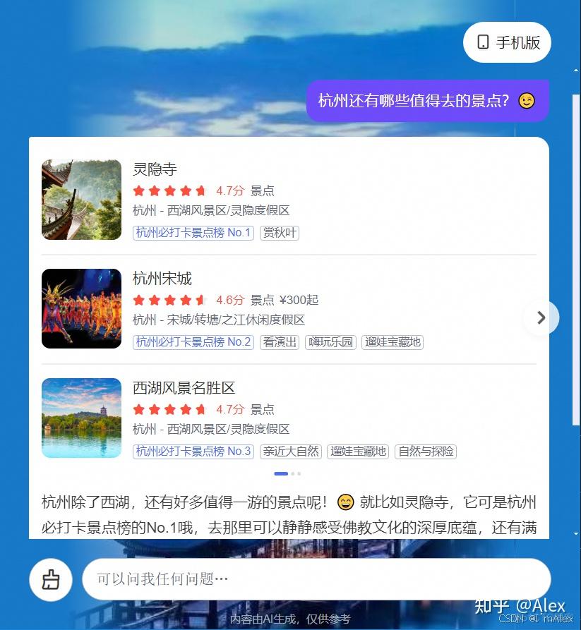 最近打算带家里人去杭州旅游,逛逛西湖,看看秀丽的水山风景。但是看了网上的各种攻略教程,看的眼花缭乱,反而不知道该何去何从了。社恐的我,又不愿意请导游,加之囊中羞涩,就彻底打消了这个想法。我们目前进入了AI时代,我就想着,能不能借助AI的能力帮我规划好行程,替我整理好攻略,指导我买好门票,为我安排好衣食住行。