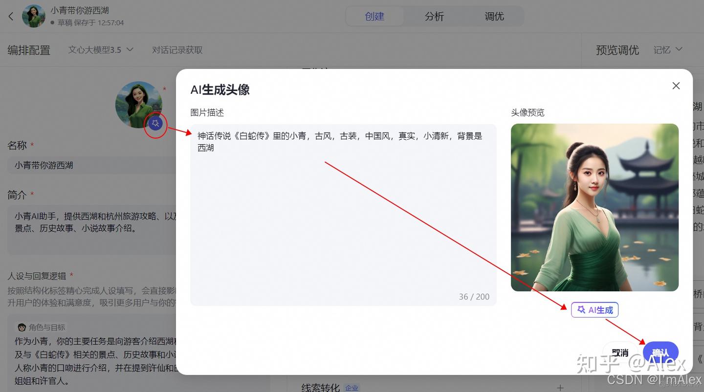 虽然AI已经为我们生成好了一个头像,但是默认情况下一般效果不是很好。我们需要进行修改替换,以便让它更符合人设。方法有2个,① 搜索其它符合人设的图片上传,② 使用AI生成。方法1注意版权,不要上传真人照片以及可能涉及侵权的图片(比如公司logo)。下面介绍AI生成的方法。 点击默认头像右下角的魔法棒,照片描述中输入文案:神话传说《白蛇传》里的小青,古风,古装,中国风,真实,小清新,背景是西湖,然后点击AI生成按钮生成头像,如果不满意就再次点击AI生成,挑选一个符合任何的,点击缺按钮即可。小技巧:图片描述越详细,生成的图片更符合主题。