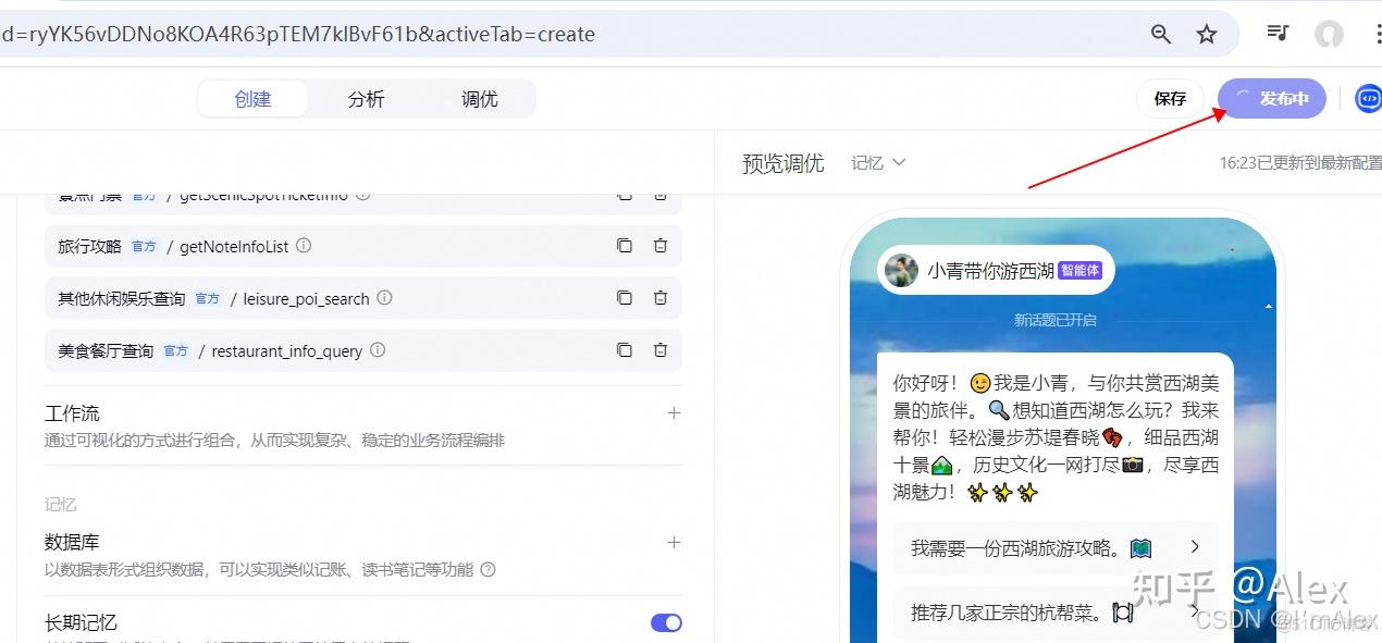 智能体创建完成,调优完成之后,就可以进行发布了。