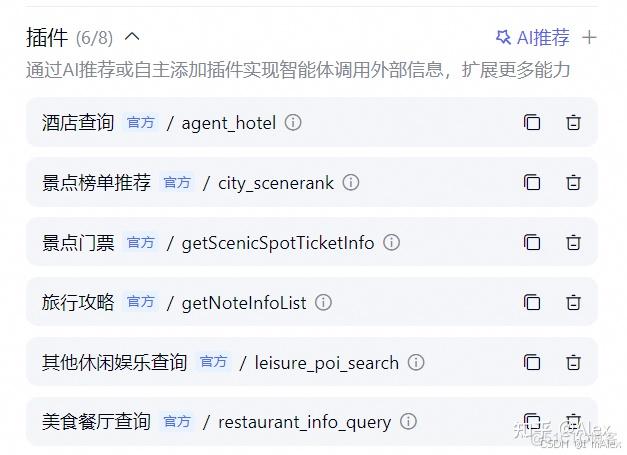关于插件,不是勾选的越多越好。原则上是只调用适合的插件,切忌不要勾选无关插件,否则会影响回答速度。比如旅游类智能体就不要添加购物推荐类的插件。