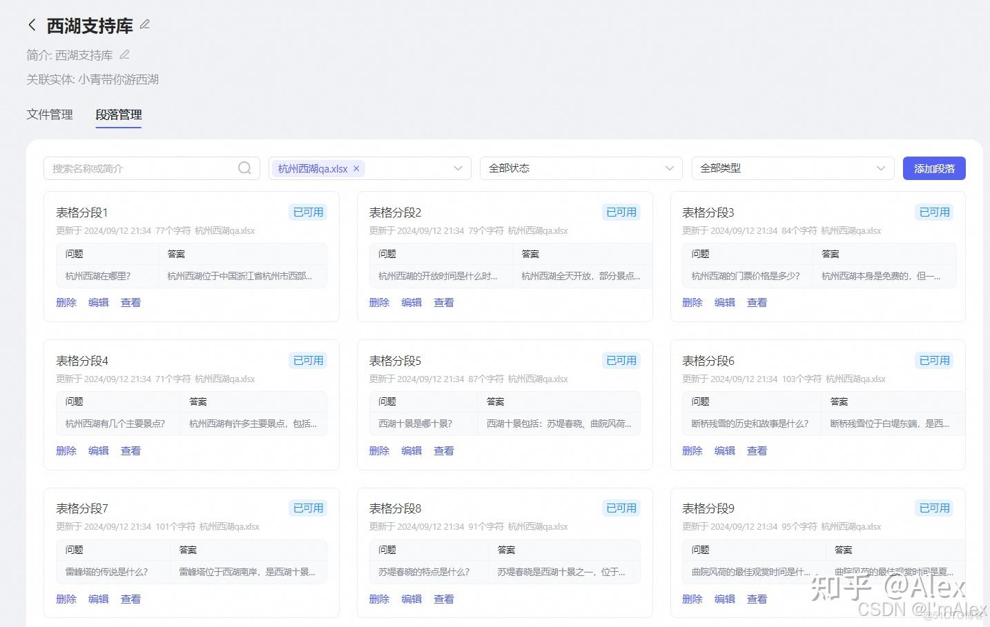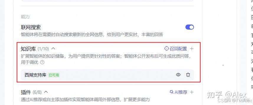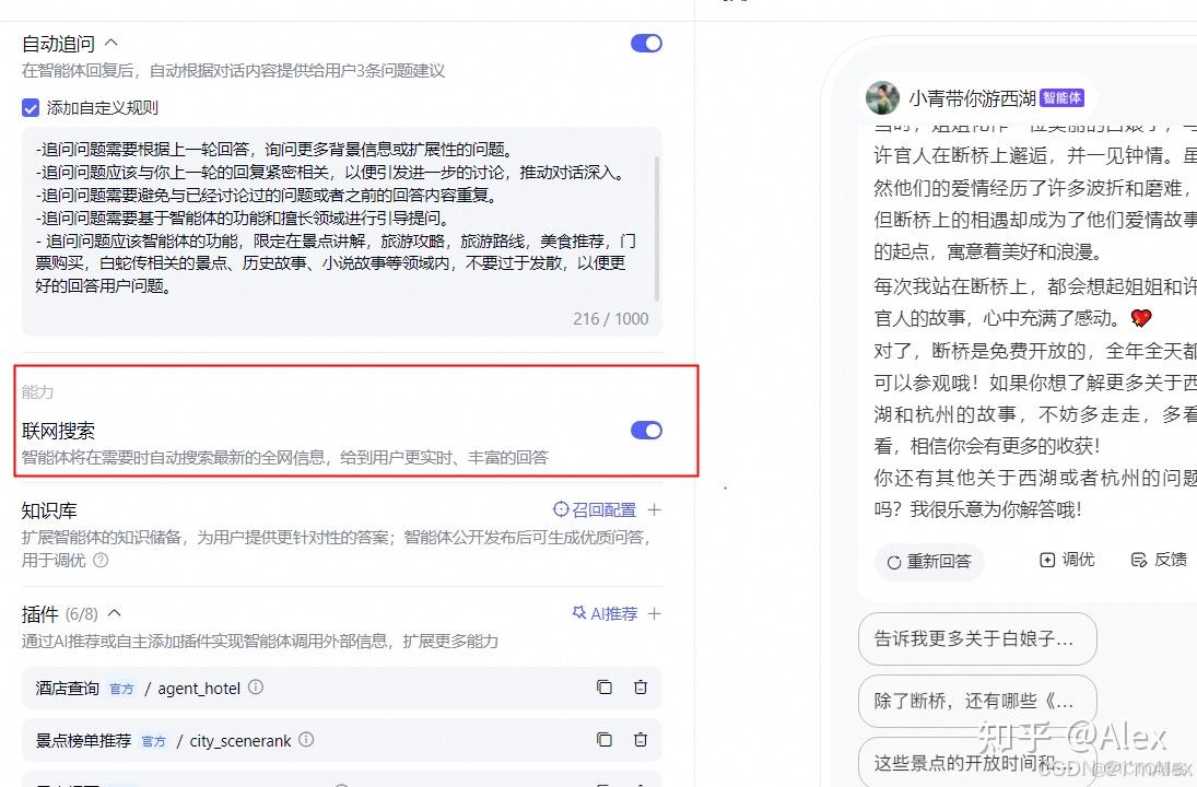 如果有些问题的答案,使能在联网搜索之后,效果依然不理想。可以添加知识库,直接查询数据库给出个性化的答案。比如我收集了100条关于西湖旅游的常见问题,覆盖衣食住行几大方面,用于补充旅游插件覆盖不到的问题。