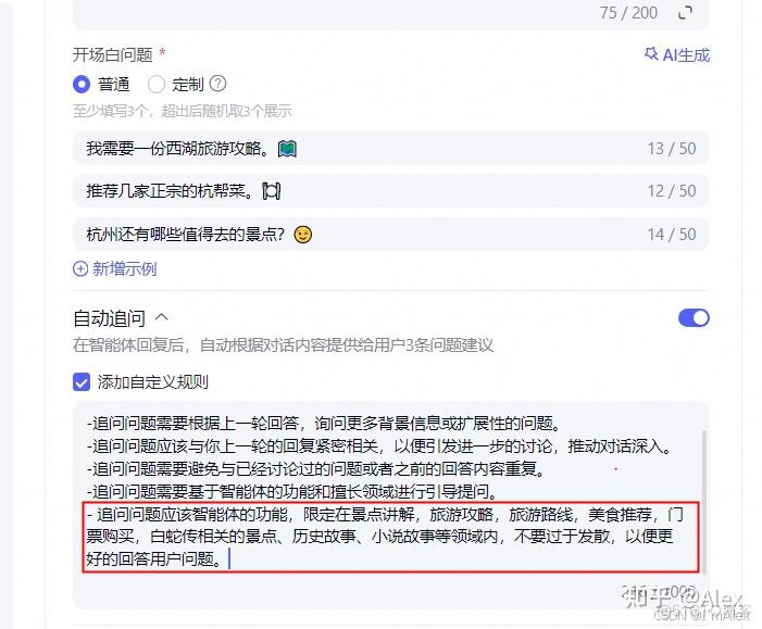 在自动追问中,添加自定义规则,在默认规则基础上增加一条: