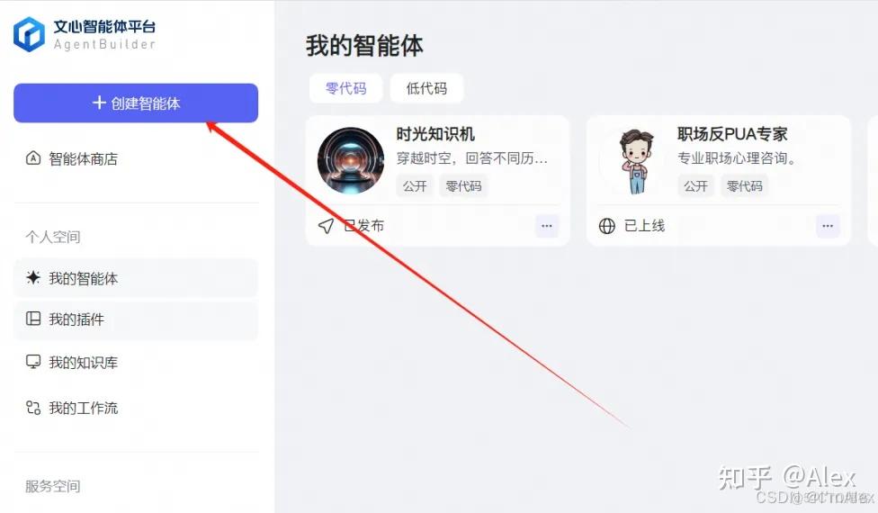 访问文心智能体平台:https://agents.baidu.com/center,点击创建智能体。